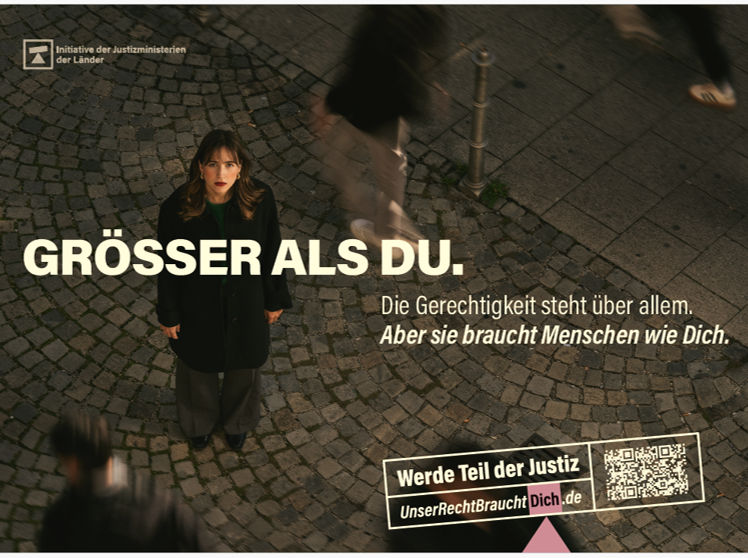 Die Justizministerien aller 16 Bundesländer haben eine bundeseinheitliche Rechtsstaats- und Nachwuchskampagne gestartet. Darin wird die zentrale Bedeutung der Justiz für einen funktionierenden Rechtsstaat und damit für die Gewährleistung von Demokratie, Freiheit und Sicherheit verdeutlicht. Darauf aufbauend richtet sich die Botschaft an jeden und jede Einzelne: "Die Gerechtigkeit steht über allem. Aber sie braucht Menschen wie Dich."
