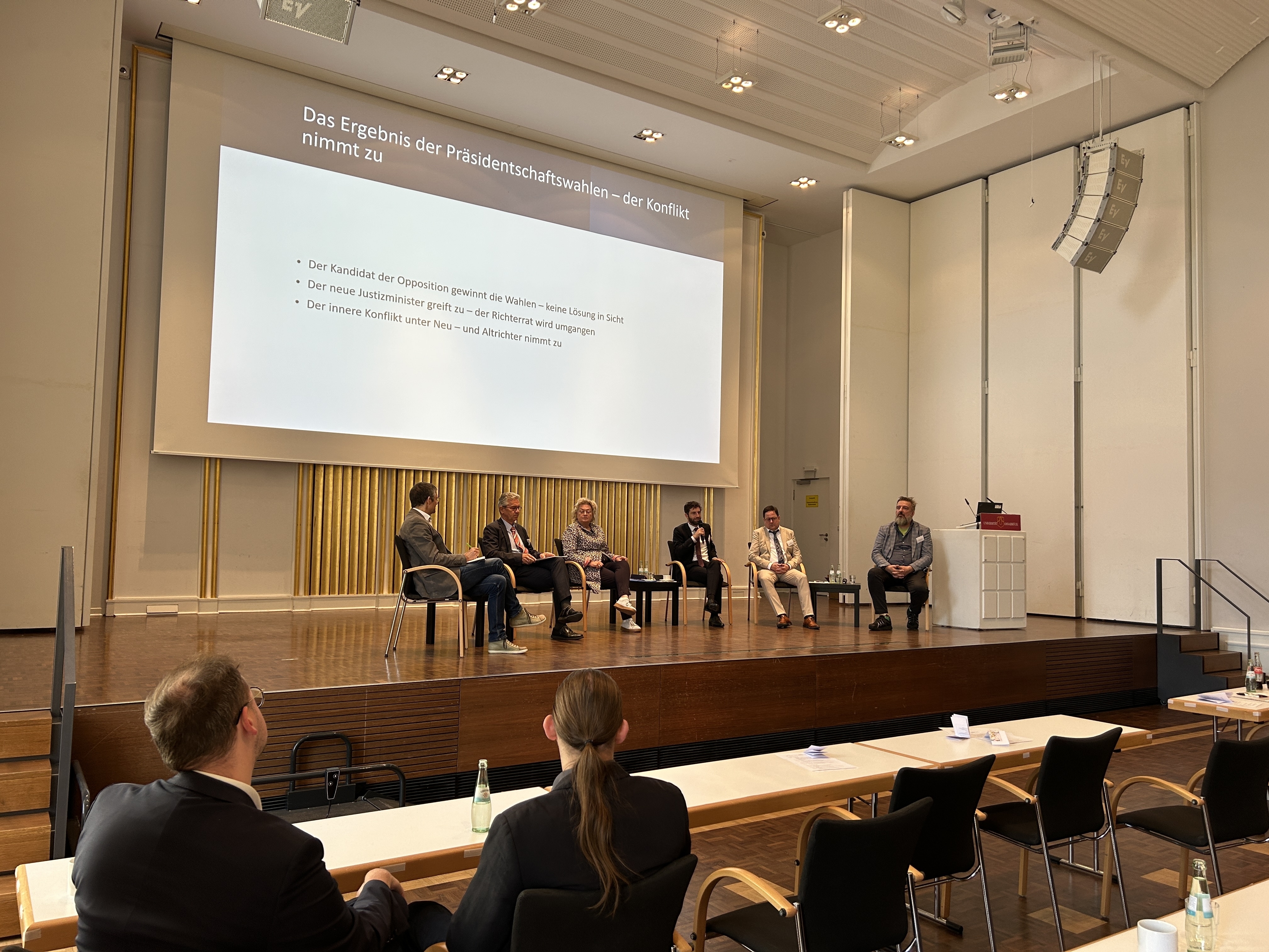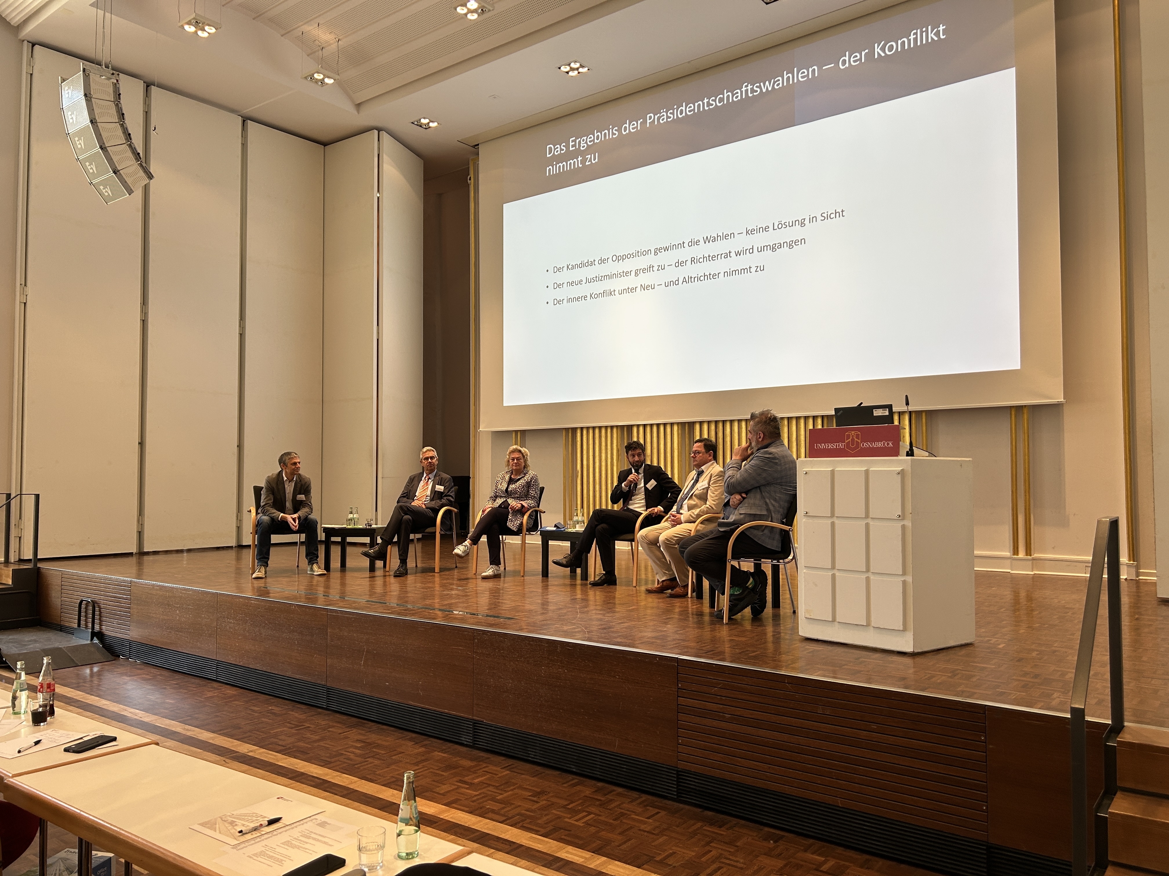 Der dritte Veranstaltungstag widmete sich der Frage der Unabhängigkeit der Dritten Gewalt, die im Rahmen einer Podiumsdiskussion durch Frank Bornemann, Vorsitzender des Niedersächsischen Richterbundes, Dr. Markus Sehl, stellv. Chefredakteur Legal Tribune Online, Dr. Thomas Smollich, Staatssekretär im Niedersächsischen Justizministerium, Prof. Dr. Afra Waterkamp, Präsidentin des Finanzgerichts des Landes Sachsen-Anhalt sowie Prof. Dr. Dr. h.c. Fryderyk Zoll von der Universität Osnabrück und der Jagiellonen Universität Krakau diskutiert wurde. Die Moderation übernahm VRiFG Christoph Schirp, der zugleich Vorsitzender des Richterrats am Niedersächsischen FG ist.